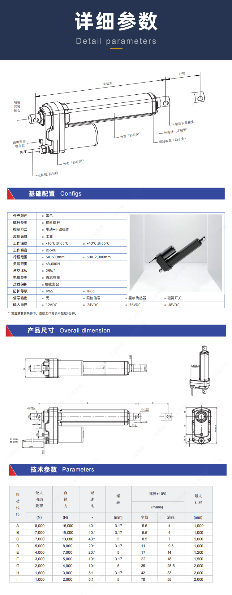 载荷: 8000N, 定制行程: 50-600mm/600-2000mm, 防护等级: IP65/IP66,