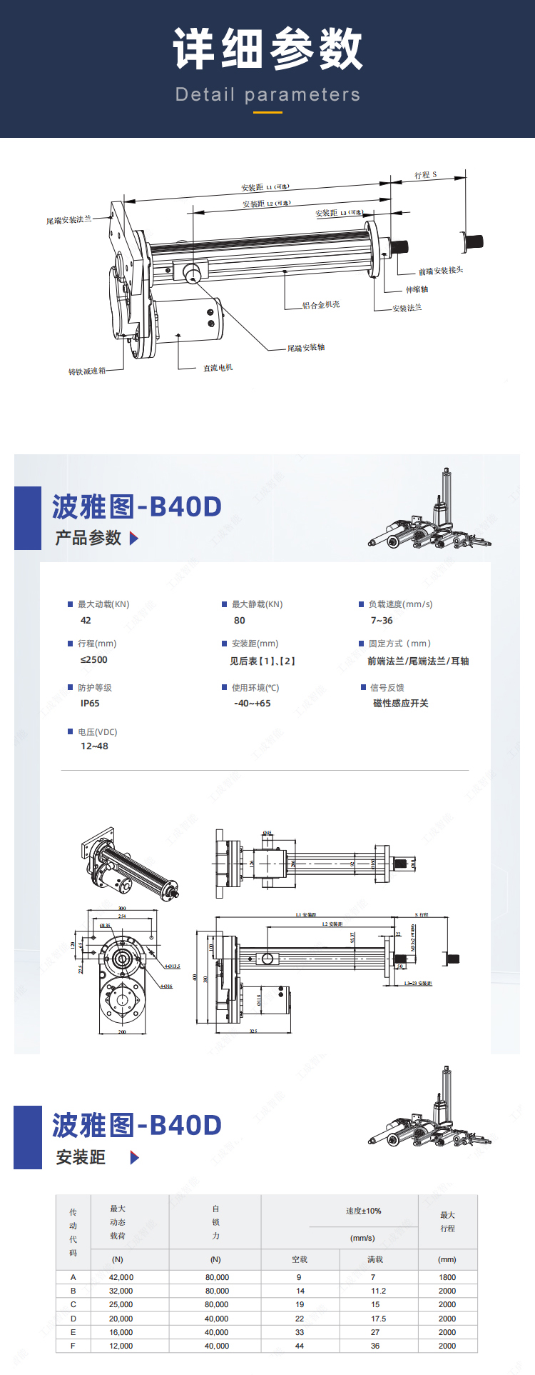 最大动载:42KN;最大静载:80KN; 负载速度: 7~36mm/s, 定制行程: ≤2500mm,